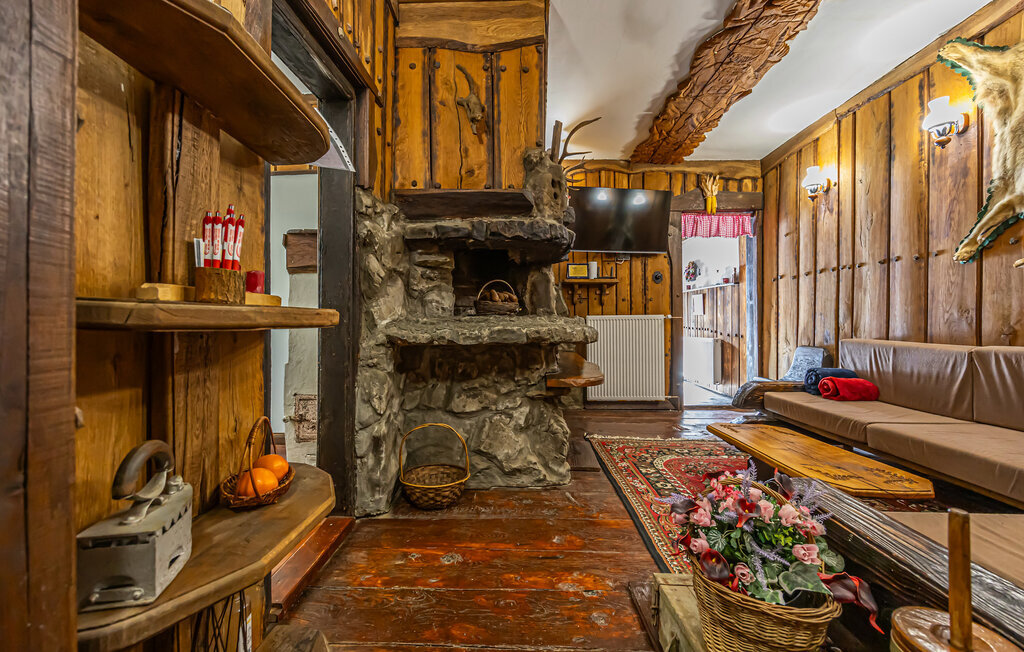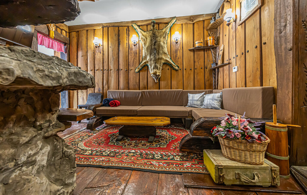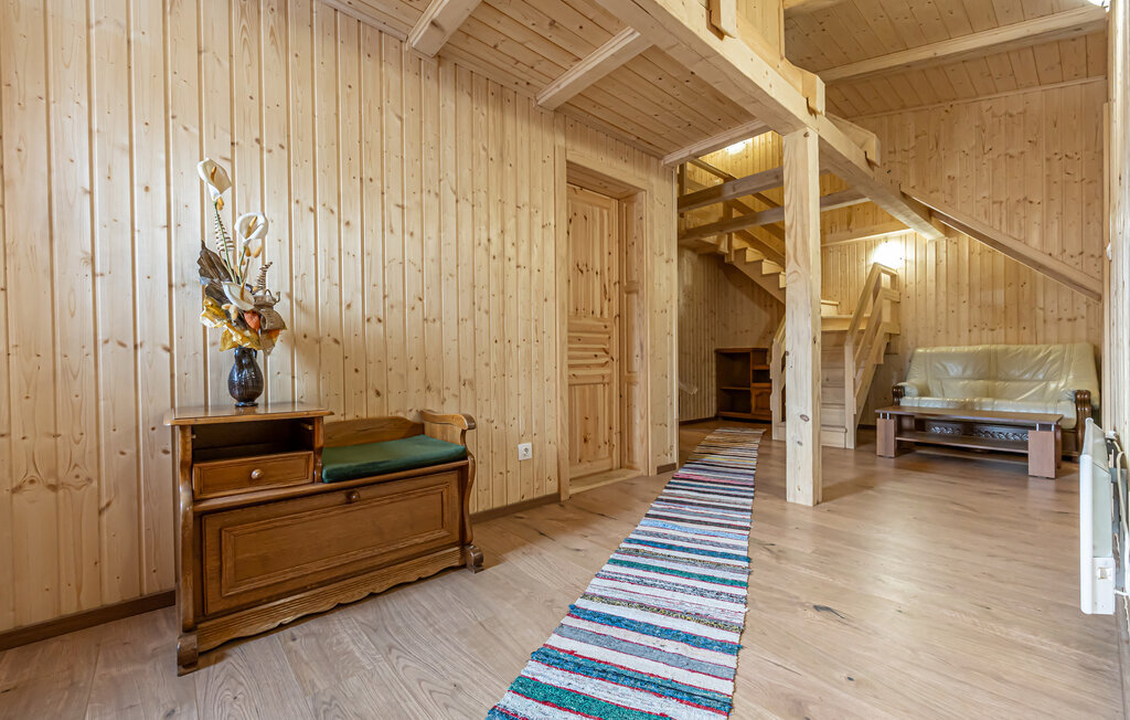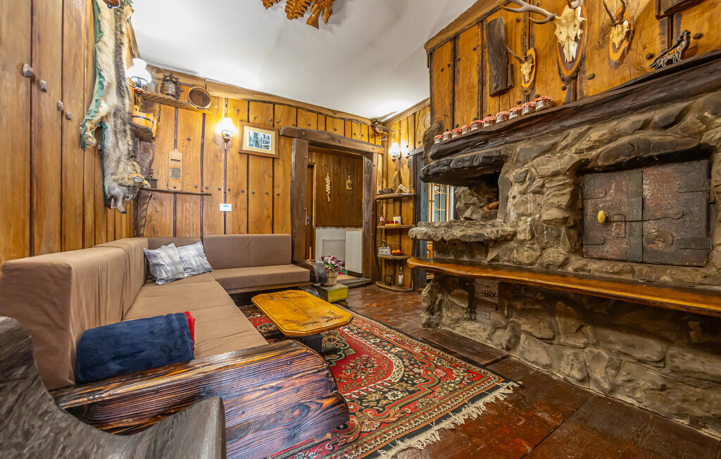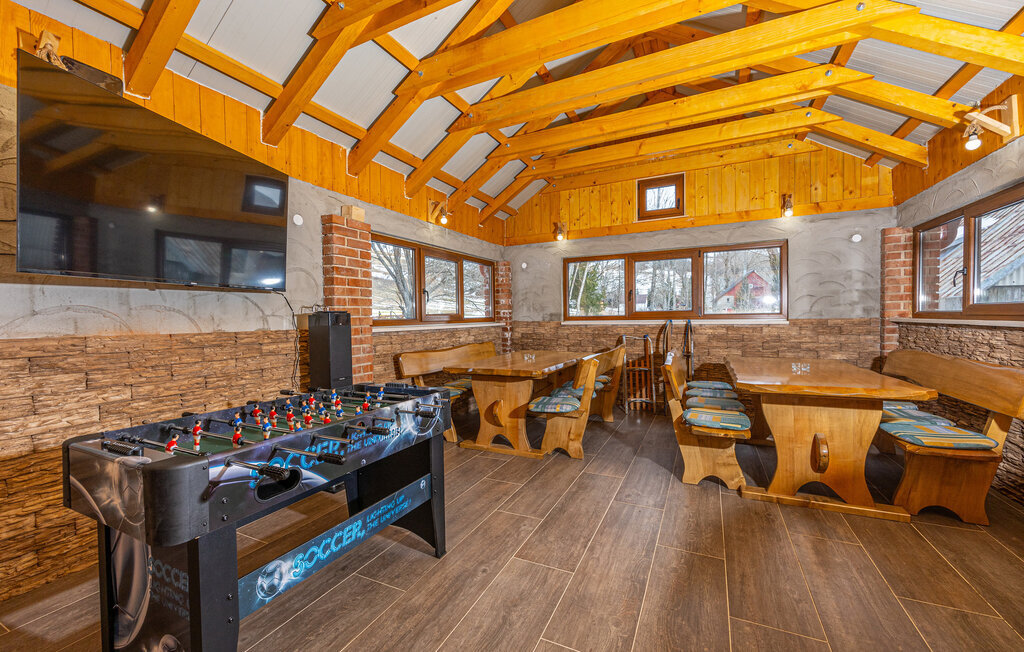 Grande maison de vacances rustique avec une grande salle commune entourée par la nature.