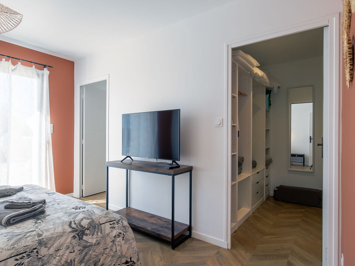 1 chambre avec Dressing avec 1 grand-lit (160 cm, longueur 200 cm), douche.