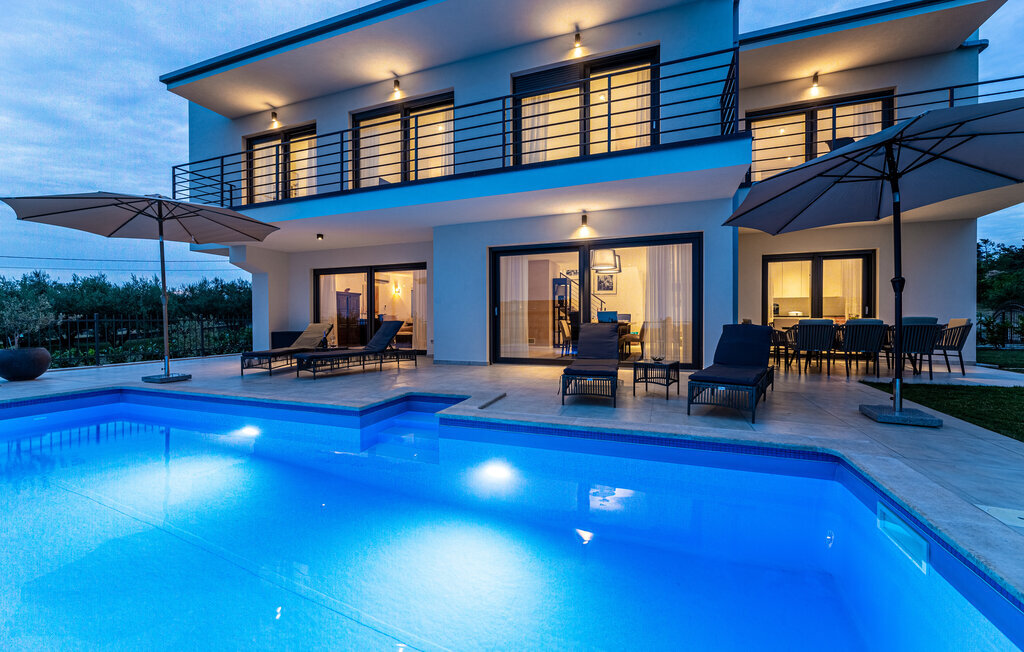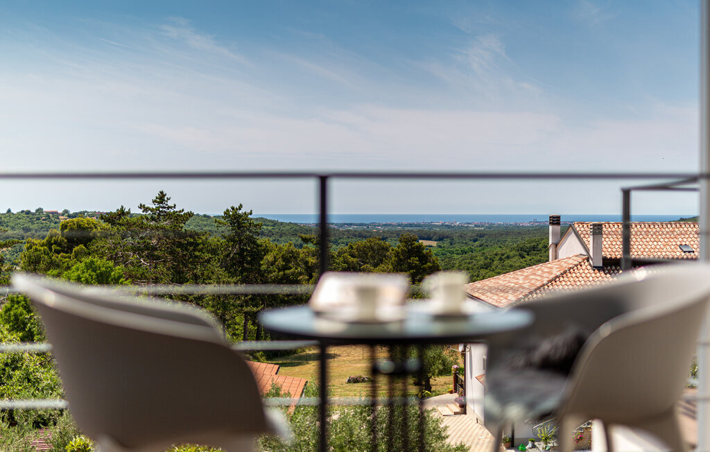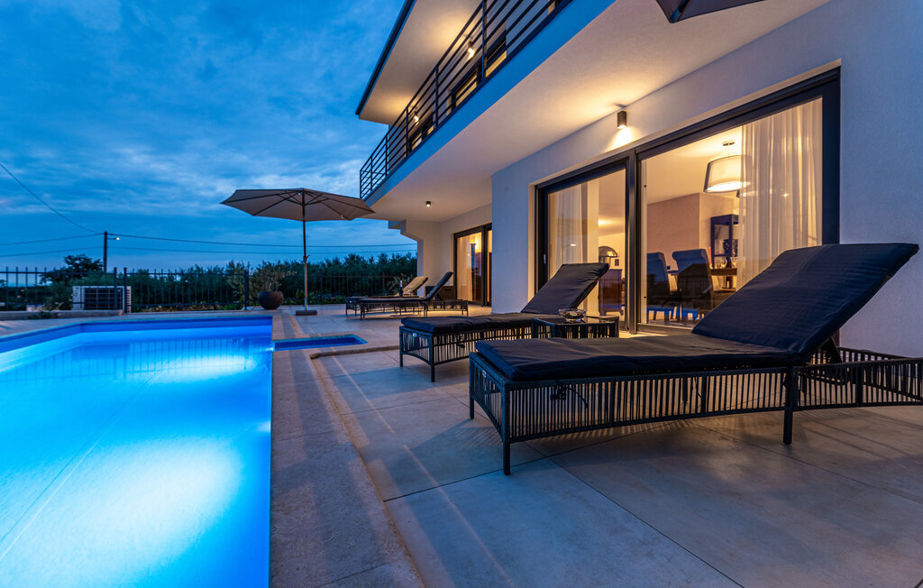 Dans un endroit calme, cette grande maison de vacances moderne avec piscine et vue sur la mer vous accueille.