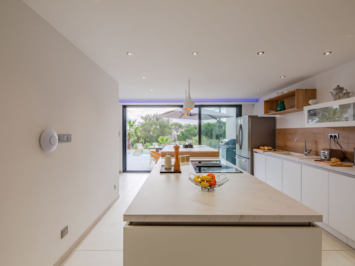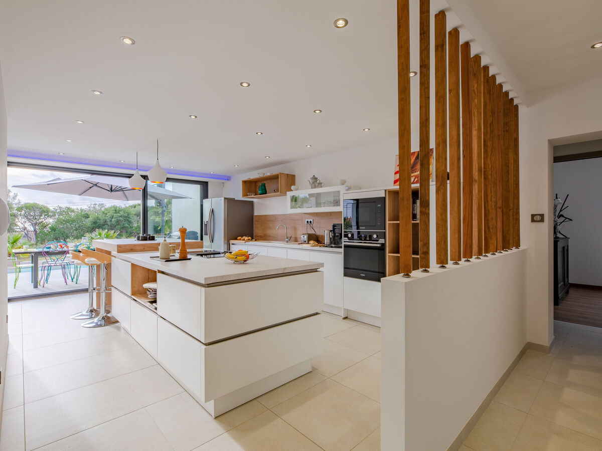 Cuisine ouverte (four, lave-vaisselle, 4 plaques à induction, grille-pain, congélateur, cafetière électrique, ilot de cuisine).