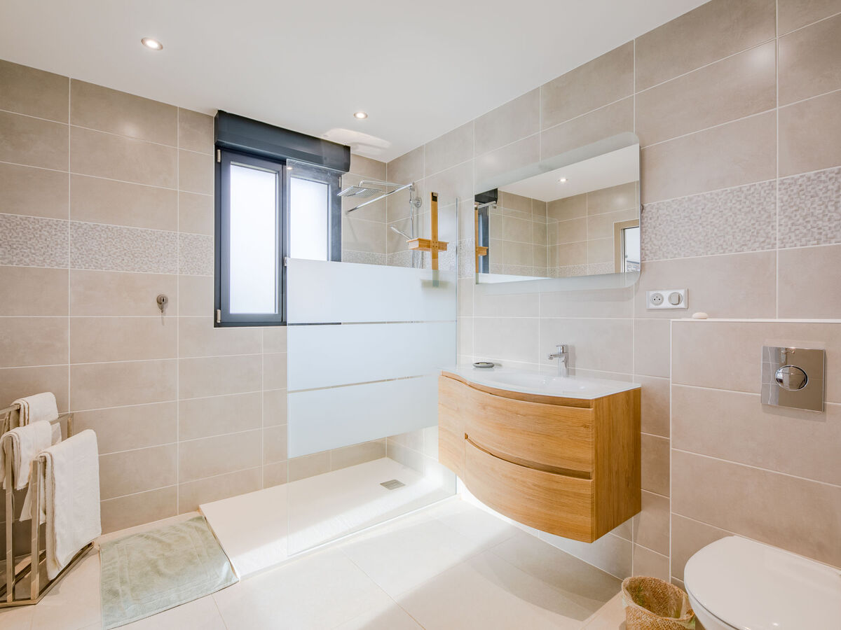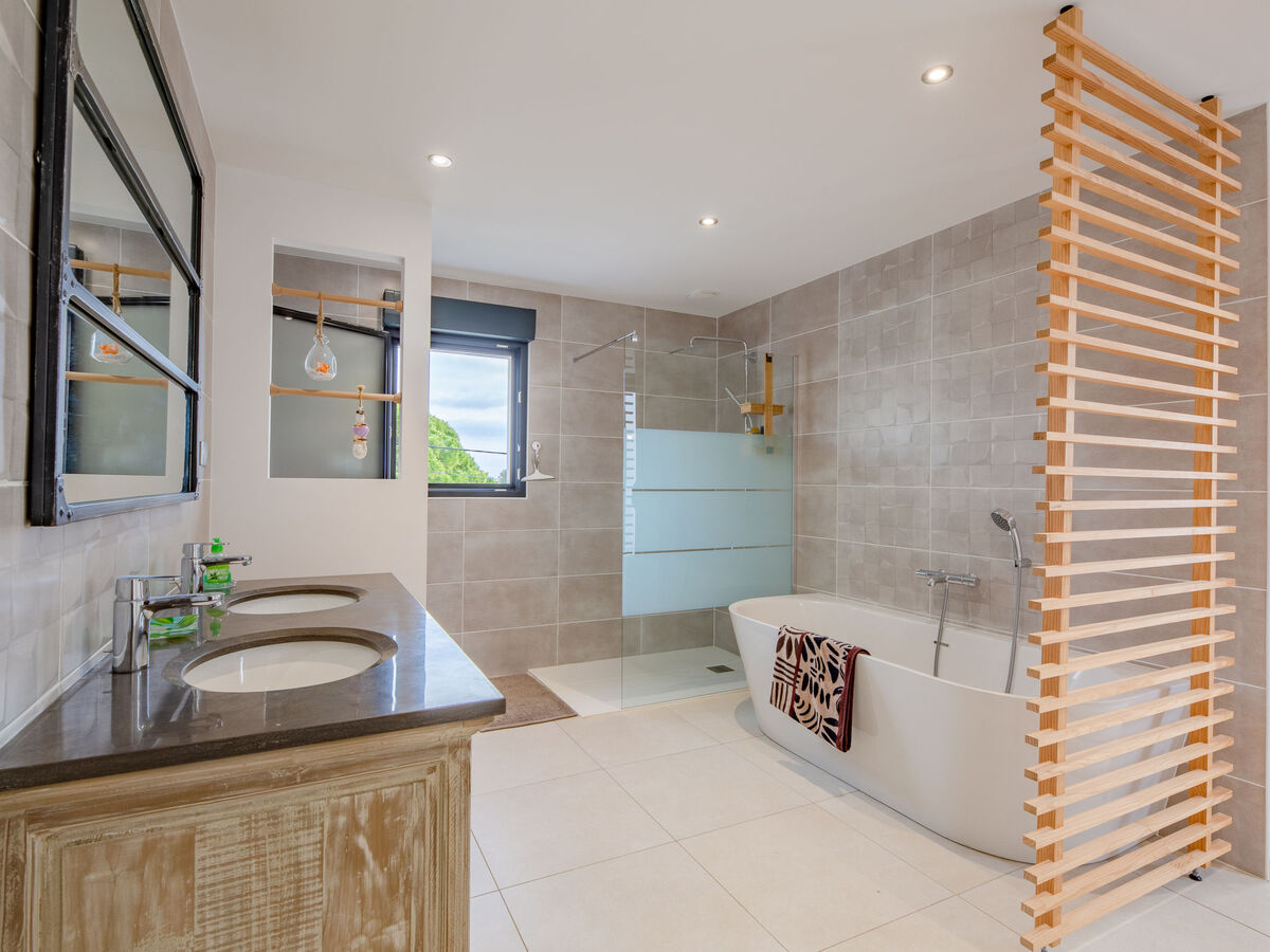 1 chambre avec 1 grand-lit (160 cm, longueur 200 cm), bain/douche/WC, double vasque et air-conditionné.