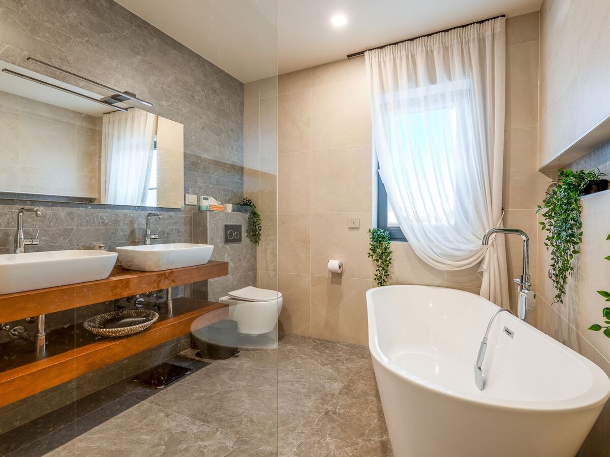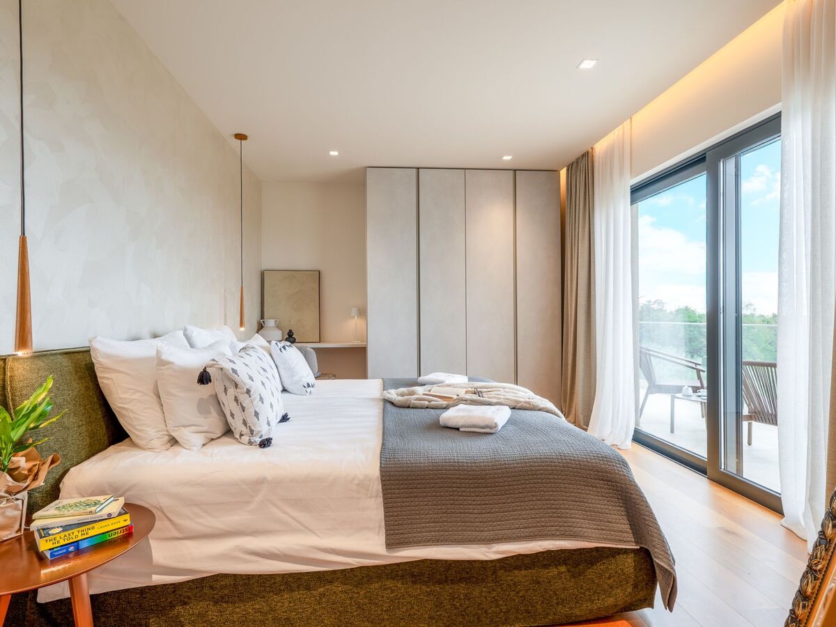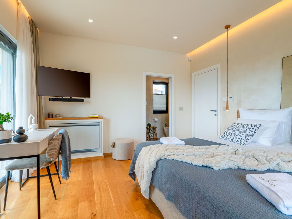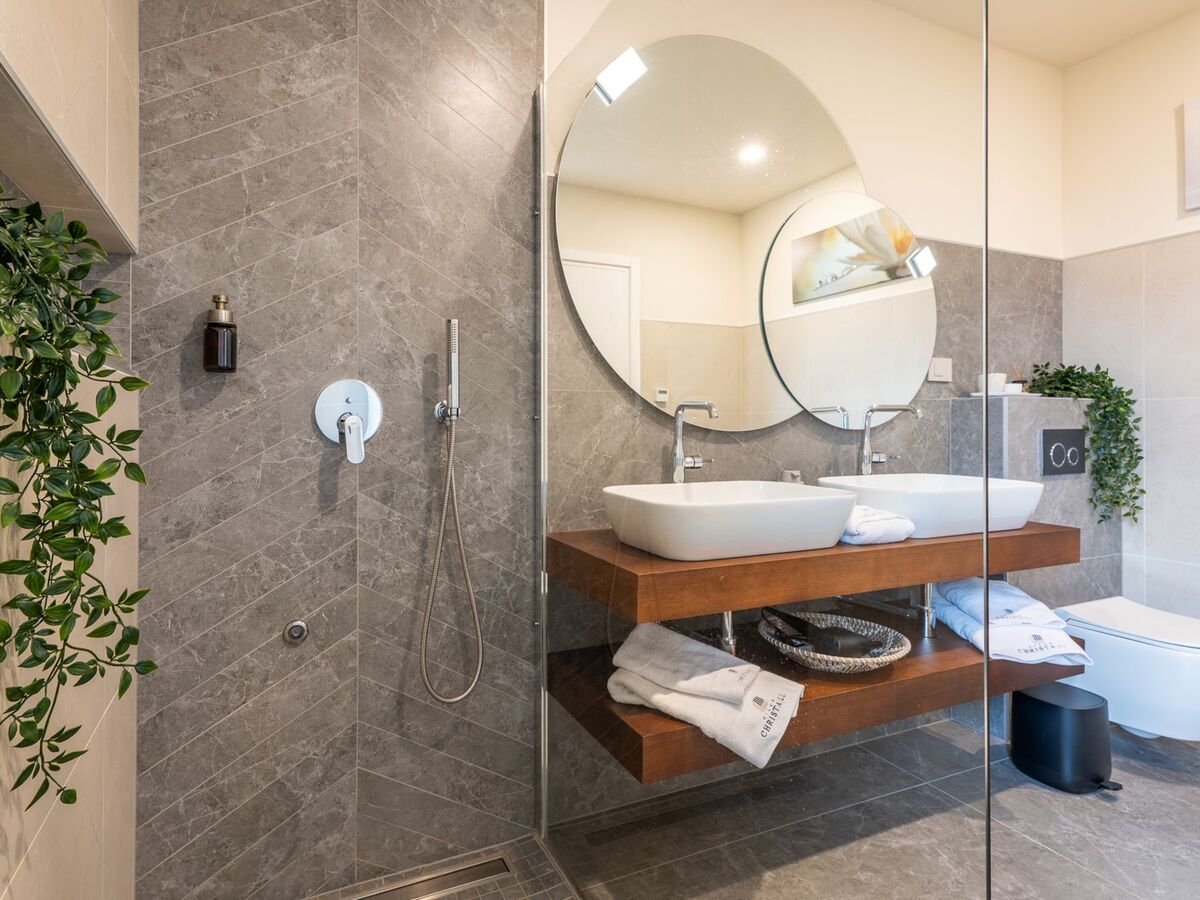 1 chambre avec 1 grand-lit (200 cm, longueur 200 cm), bain/douche/WC, double vasque, TV (satellite) et air-conditionné.