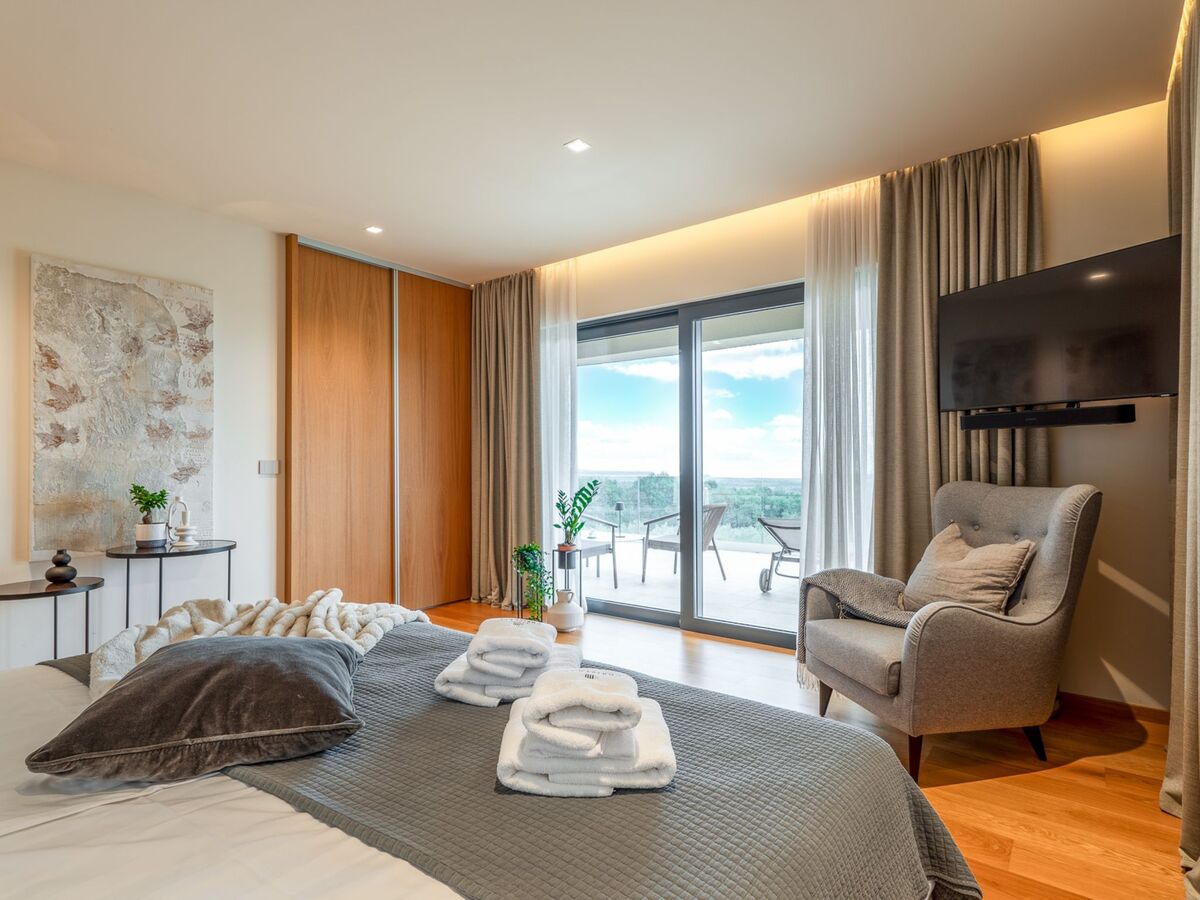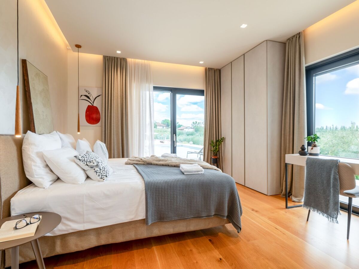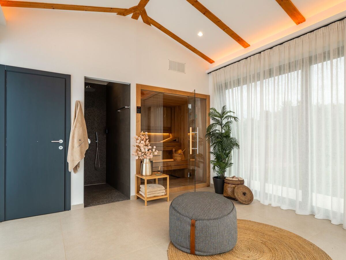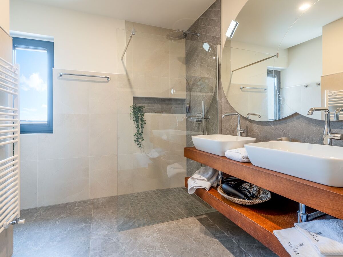 À l'étage supérieur: 2 chambres, chaque chambre avec: 1 grand-lit (200 cm, longueur 200 cm), douche/WC, double vasque, TV (satellite) et air-conditionné.
