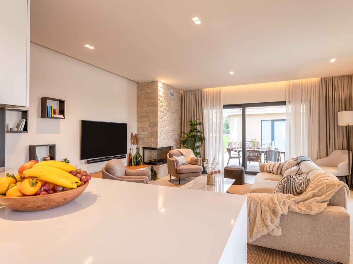 Spacieux, aménagement moderne et de bon goût: séjour/salle à manger avec cheminée (uniquement à titre de décoration), TV (satellite) et air-conditionné.