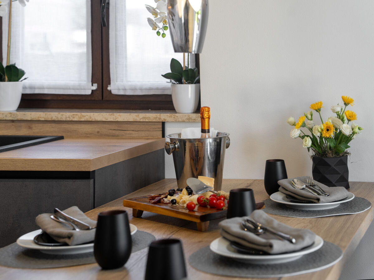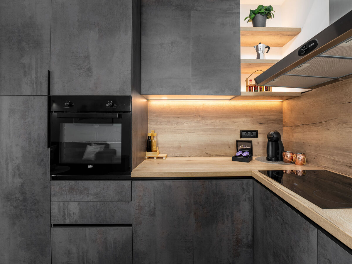 Cuisine ouverte (four, lave-vaisselle, 4 plaques vitrocéramiques, grille-pain, bouilloire électrique, micro-ondes, congélateur, cafetière électrique).